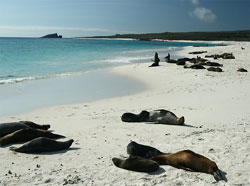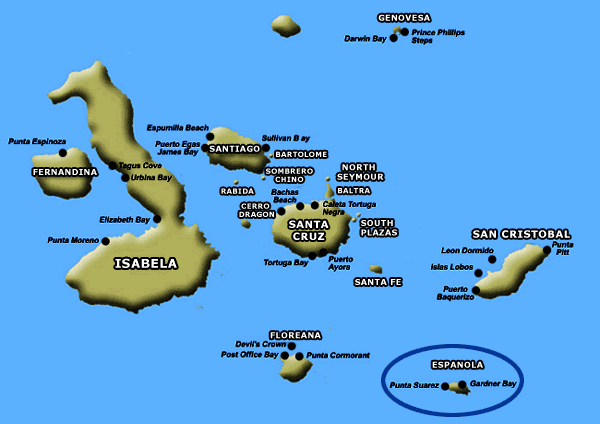 Epanola, also know as Hood island, has two important sites: Punta Suárez, is a rocky point that sustains one of the most impressive and varied colonies of sea birds in Galapagos. Espanola has high cliffs rising up from the sea, where you will find spectacular views of soaring birds, and the famous blowhole where water spouts from 50 to 75 feet into the air. The other visitor site is Gardner Bay, located at the eastern coast of Hood Island. At Gardner Bay there is an excellent beach of white sand for swimming and the opportunity to observe the Galapagos Sea Lions up close. Gardner Islet is a near by snorkeling destination with the possibility of the sea lions joining you. Another snorkeling destination is Osborn islet