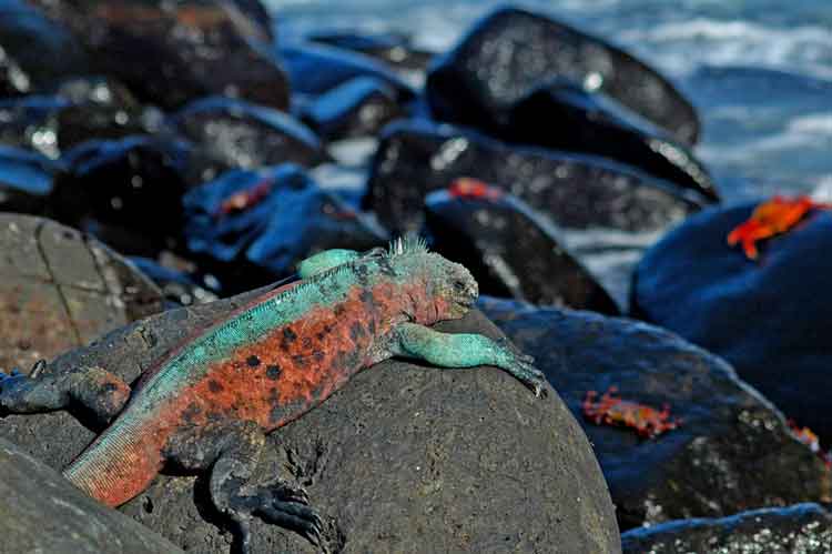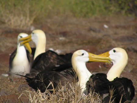 Uplifted by a submarine lava flow and its location at the southeastern edge of the archipelago makes Espanola one of the oldest islands. Here you will find sensational seabird viewing and the worlds main breeding colony of Waved Albatrosses at Punta Suarez. Here you can see Nazca Boobies and Blue Footed Boobies up close and see the chicks. Easily seen red billed tropic birds, Galapagos doves, Swallow Tailed Gulls, Galapagos Hawks and Warbler Finches and small ground finches, one of only two sites for large Cactus Finches. Galapagos Sea Lions are on the beaches and swimming everywhere, and the spectacular and uniquely colored Hood Marine Iguanas (Christmas Iguanas) will be all around you waiting for pictures. Some of the endemic species you will see are the Hood Mockingbird, the biggest lava lizards and racer. Relaxing bahia Gardener offers abundant sleeping sea lions, great snorkeling and close up views of Galapagos Hawks and curious Mockingbirds.