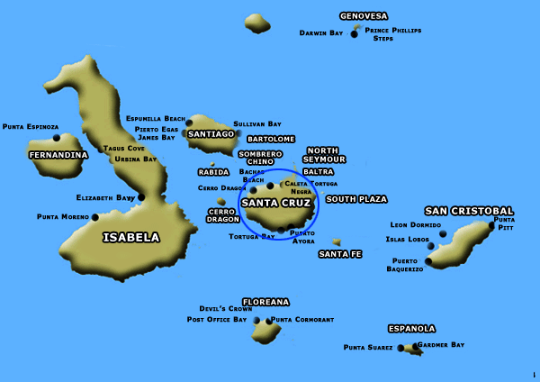 Center of the archipelago is Santa Cruz island, where the volcanic activity has long ceased, and now this island is the focal point for the Galapagos. Santa Cruz has the largest human population any of the few islands that people inhabit. The population is mostly centered in the port city of Puerto Ayora. On the south shore of Santa Cruz, Puerto Ayora is a pretty little oceanside community with many hotels, hostels, restaurants, dive shops, art galleries, and gift shops. There are a few ATM machines located by the main harbor, Academy Bay, and further east along Av Charles Darwin on the way to the Charles Darwin Center.
