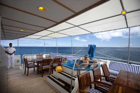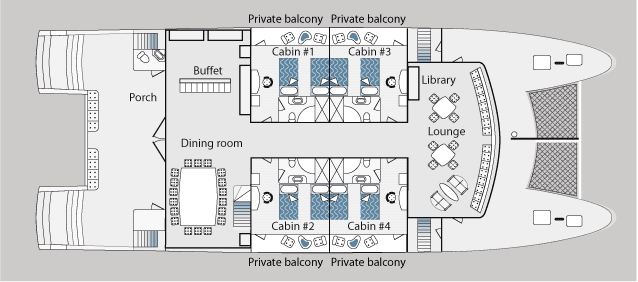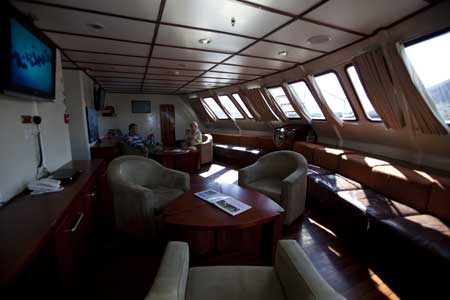 - Other facilities: The main deck has the dining area and a separate comfortable lounge area complete with plasma TVs, lap tops (No internet service), DVD player, stereo and library.