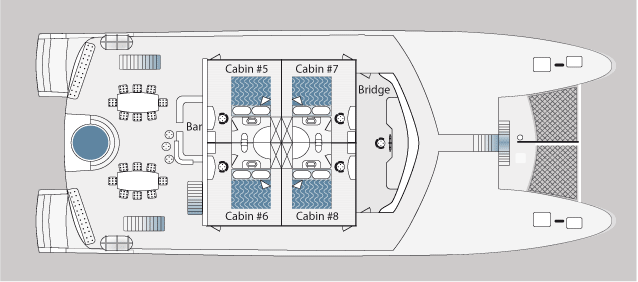 - Cabins: 8 double cabins: 4 with twin low beds and 4 with matrimonial beds, all have private bath and shower with hot water