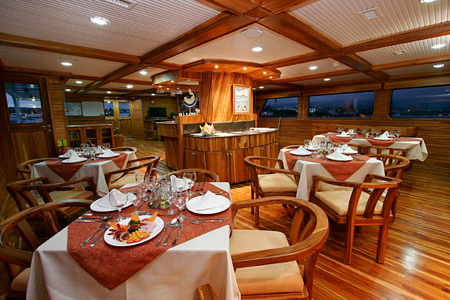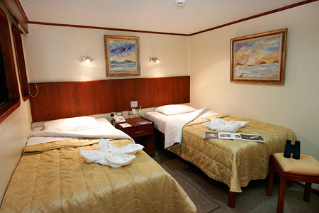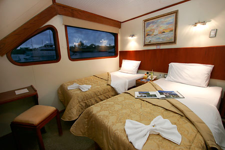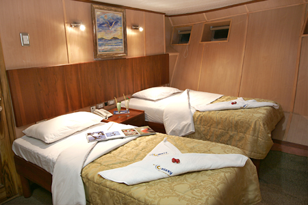 - Cabins: beautiful and comfortable double cabins with lower beds and outside views; 3 on the lower deck (twin beds), 3 cabins on the main deck (2 with twin beds and 1 that could be twin or 1 double bed), one of these has a sofa bed and can be used for 3 people. The other 3 cabins on the upper deck (they could be twin or double bed cabins), private bathrooms cold-hot water, air conditioned, safe box, hair dryer.